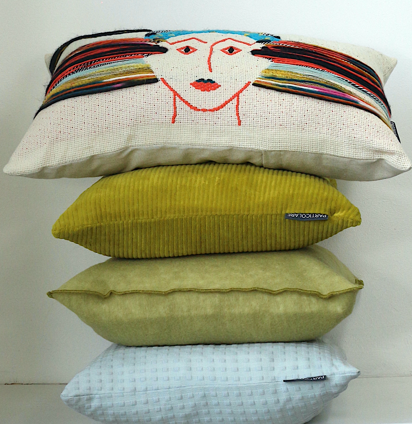 De stof van dit  kussen is met de hand geweven en ook het kussen zelf is met de hand gemaakt. Onze eigen stof ontwerpen kun je zien als een kunstwerkje op je bank. Je ziet dat deze stoffen uniek- en met de hand geweven zijn. Deze bijzondere stoffen worden normaliter gebruikt voor de Haute Couture. Wij zijn de enige op de hele wereld die van deze mooie stoffen kussens en poefs maken. Met dit kussen kun je je onderscheiden en heb je echt iets unieks op je bank liggen.