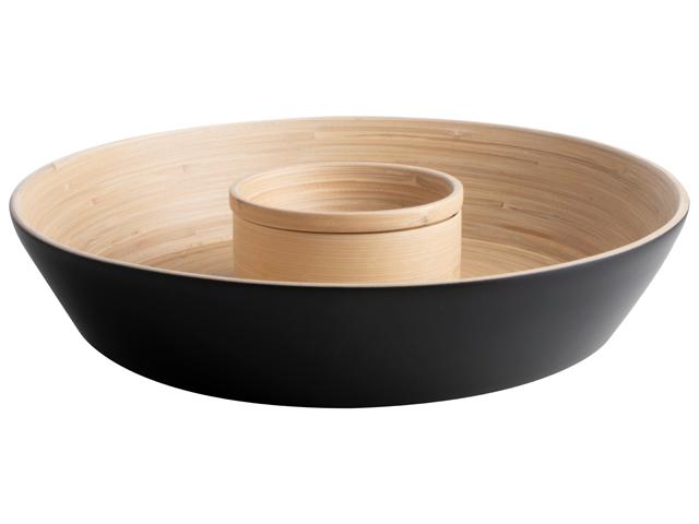 De schaal is gemaakt van bamboe en de buitenkant heeft een matte finish in een zwarte kleur. De diameter is 29 cm en de hoogte 6 cm. Let op, de schaal mag niet in de vaatwasser, oven of magnetron.
