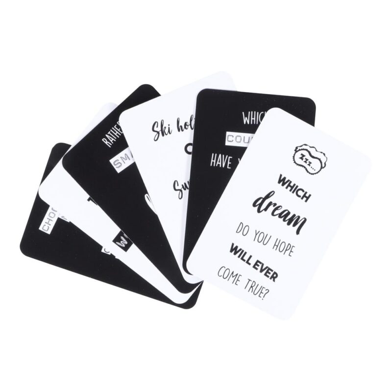 Uit leuke vragen komen de mooiste verhalen. Dit Friends & Family spel voor jong en oud is een garantie voor een gezellige avond om elkaar (nog) beter te leren kennen. Met de speelkaarten stel je elkaar originele, grappige, maar ook serieuze vragen. Elk spel bevat 50 speelkaarten met een totaal van 100 verschillende vragen.