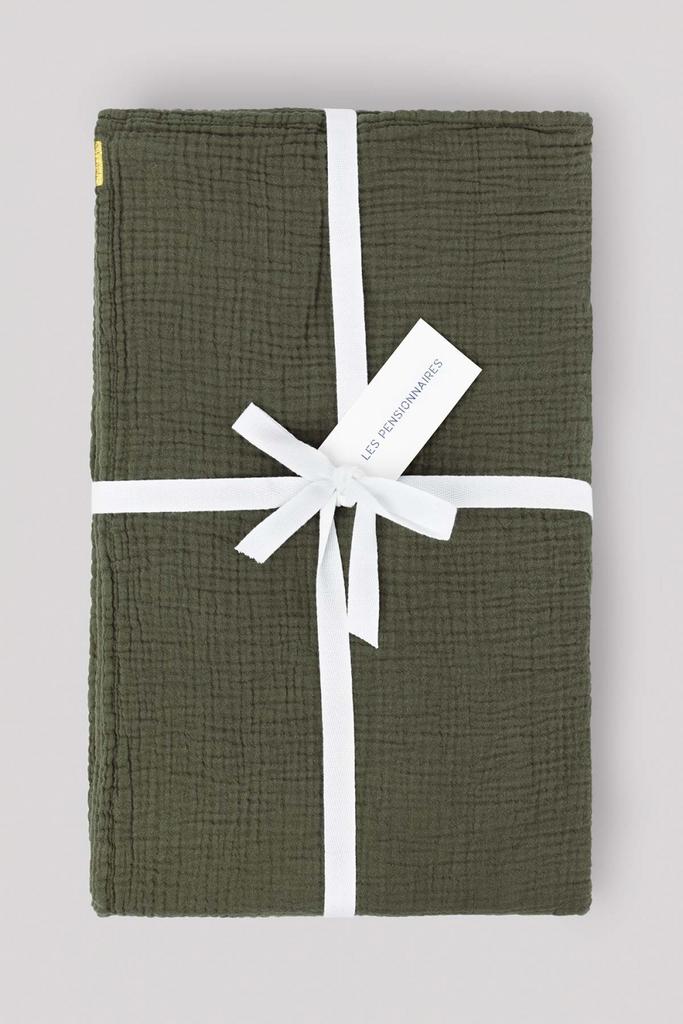 Grote dubbel katoenen plaid met een licht reliëf, 120×170 cm, zacht, praktisch en mooi! Gebruik hem om van kamer naar kamer te lopen, om mee te nemen voor een wandeling, om mee op de bank te kruipen, ’s nachts een kind lichtjes te bedekken of om een tafel te versieren. Het is een plaid, het is een stola, het is een strandlaken, het is een elegant decoratiestuk. Je kan er van alles mee! Het plaid heeft een gouden borduursignatuur van het merk Les pensionnaires.